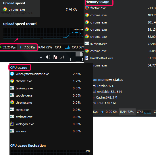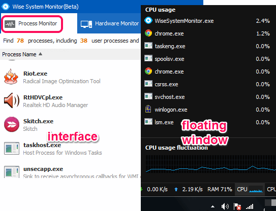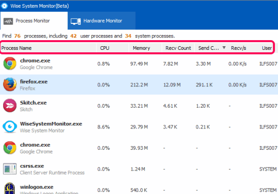 Wise System Monitor (beta) is a free system monitoring software to monitor running processes and check RAM usage in real-time. It can show you system processes and user processes list in its beautiful interface. You can also close any process immediately. Apart from this, you can also check live upload and download speed for each individual process.