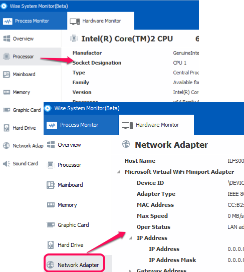 With each component, full details are available. For example, clicking on Network Adapter option will explore information about Device ID, adapter type, MAC address, Gateway address, and much more.