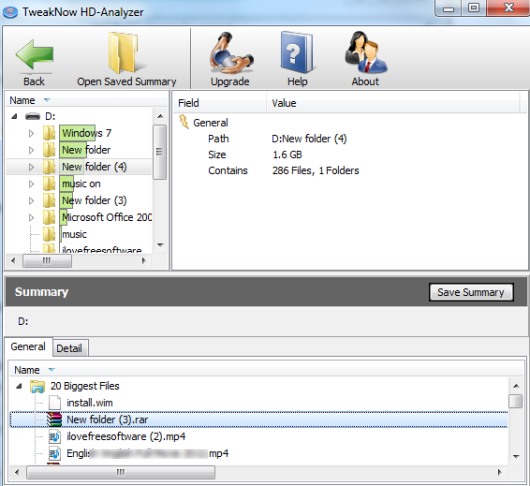 TweakNow HD-Analyzer is a hard disk space analyzer that helps to quickly find out largest files and folders available on PC using most of the hard disk space. It scans a selected hard drive and shows you results including 20 biggest files available on PC. Thus, it is helpful to find a file or folder using hard disk space uselessly, which you can delete to gain some disk space.
