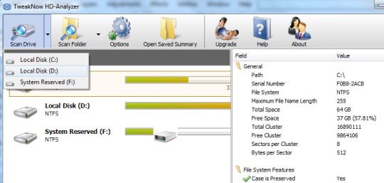 Interface of TweakNow HD-Analyzer is simple and provides separate buttons to start scan for a hard drive or a folder. You can either choose a hard drive using drop down menu or can simply double-click a hard drive to start the scan. And to scan a folder, you need to search and select that particular folder.