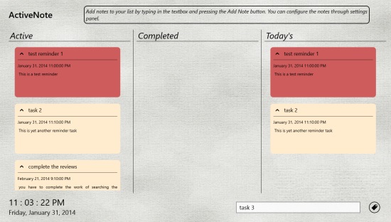 As you get to the main page of this free Task Reminder App, you would be shown three categories available as vertical panels. These are mainly : Active, Completed, and Today’s, in which the respective tasks are available.