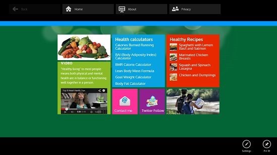 You can go back to the Home page of the app, read the About section or see the Privacy details of the app, via the control bar at the top. From the control bar at the bottom, you will be able to access the settings of the app or to pin stuff to the Start Screen. To sum it all up, this is a well designed app for all health fanatics!
