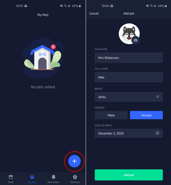 Now, you go to the Pets section in the app and then start adding new pet profiles. Just tap on the “+” icon on the bottom right side and then start specifying the pet details. Enter the name, nickname, breed, gender, and date of birth. You can also add picture and this way add other pets in the database.