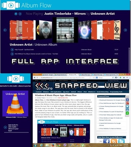 Album Flow is another good music player app for Windows 8 to have on your device. This app supports playback of multiple audio file formats, and can serve as a great lightweight app for playing music on the go. Before I get started with the features- let me first tell you that this app also only supports playback of music that’s present on your Music Library, and there is no file browser built into the app that allows for navigating and selecting the track that you want to play. Now. the features. The app has a very nice interface that shows the album arts of the music files in a flow style- if you have used an iPod touch or iTunes, you might be familiar with this kind of interface. The songs can be switched by clicking on the track that you want to play from the playlist that displays itself at the bottom of the album arts. The app supports docked view as well, and this works like a charm. In the snapped view, you will be able to see the album art of the track being played, and standard playback controls like play, pause etc. As a matter of fact, there is only one button to control play and pause operations: the play button changes to pause button when the track is playing and vice versa.