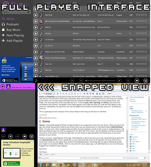 Stereo is another beautifully designed Windows 8 app that allows you to playback music from your device. When you launch the app, the screen that presents itself on your screen shows you the tracks present in your Music Library (Libraries\Music) folder. The app works well in snapped mode and offers the basic playback controls on the screen in snapped mode as well. Upon launching the app, the tracks are displayed at the right side of the screen, and the playback controls are present at the bottom of the screen. Towards the right side, you can choose to play either the stored music or the saved podcasts on your device.