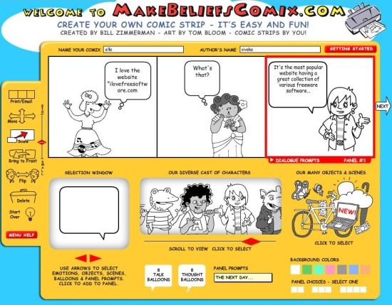 MakeBeliefsComix is a free comic creator that lets you create cool and funny comic strips. This comic creator offers you a very simple and user-friendly interface, as it provides you all the options right in front of your screen, in very simplified manner. This free comic creator lets you select the desired items and comic character which you wish to include in the comic strip. It offers you various characters, text notes, dialogue boxes, emotions, speech and thought bubbles, so that you can make an appropriate choice and create an attractive comic strip instantly.