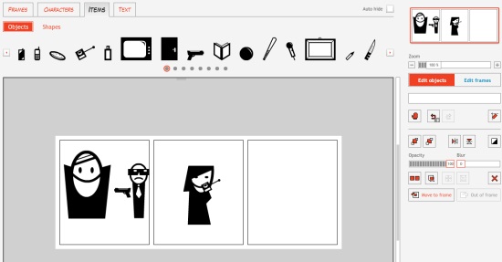 StripGenerator is a free online comic creator that allows you create comics strips using frames, characters, items, and text. This comic creator provides you drag and drop interface along with rich comic creating tools, so that you can customize each and every aspect of the comic strip. While creating funny comic strips, you can perform various actions like resizing, , flipping, sending the objects to and from by adjusting layers, moving objects between frames, adding effects like blur and transparency, adjusting the opacity, and much more.