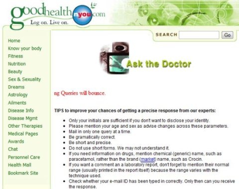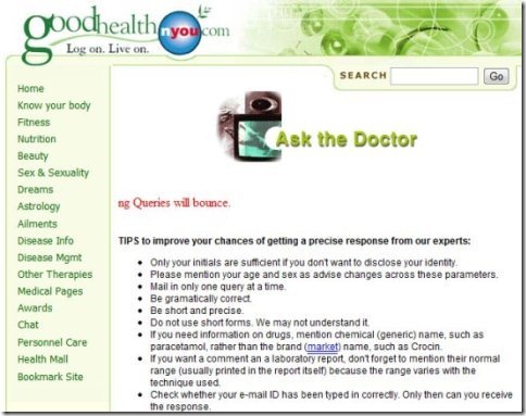 Goodhealthnyou is a free web service which offers you free online medical advice for any kind of health related query. This service also includes a search box from where you can search any answer for your query. Putting up a question is really an easy task on this website. You should keep in your mind some of these tips before asking a query. The query should be with a limit of 300 characters and it should be precise and short without any spelling mistake. For putting up a query, you need to feed in some personal information along with the question and click on the submit button at the bottom. Make sure that your email address is entered correctly because you will get your answer on your email. This website also includes a doctor chat feature, but it was not working as I tried many times.