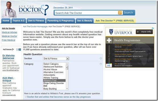 Askthedoctor is a one of the best website which gives you free medical advice on any of your health related query. This is an easy to use web service and includes a search bar. Before you put up a question to this service, you should search it by typing your question in the search bar. It is possible that this website may already have answer to that question put up by another user. So it would be better if you first search the answer for your question in the search box. Asking a question is very simple, as you need to select a section from the drop down menu, then select the category. When you select the category it shows you other related articles, which you can go through. Now type in your health related question.