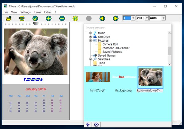Application comes with a large selection of different calendar templates. They are mostly divided up into 2 categories, templates where each month goes on its own page, or where all 12 months are on a single page. Calendar elements can be adjusted manually, up to a point (left-right movement of images is limited for example). Custom images, graphics and text can be added to the calendars. Double left click on an element in the preview box loads editor for that element. Lots of settings for tweaking is available, so it might take some time to get familiar with TKexe, but it’s worth it if you ask me.