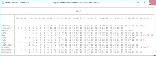 What it does do is generates simplistic text calendars for basically any year after the year 1759. Basic idea behind this calendar generator is to use the calendar info generated by the Easiest Calendar Creator and embed it into better layouts, that you create yourself. Calendars generated by this software will be saved automatically as a TXT, and can be printed “as is”, if you want a very basic calendar.
