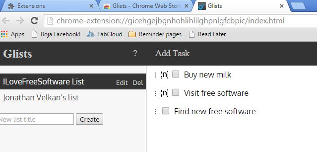 Once everything is setup, you’ll be able to access, create, manage and check off Google tasks from within Chrome, simply by launching Glists. Multiple lists can be managed at the same time, that’s what the sidebar on the left is for. Don’t forget to do that satisfying check mark placement next to the completed tasks on the list.