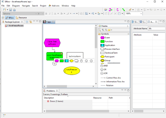 Bflow is an open source business process management software. It has a clean interface which is divided in three parts. The middle part helps to create and edit business processes. The left section shows the projects and workspaces created by you and the right section provides palette. The palette is an important part as it contains event, function, process interface, InternalPerson, ExternalPerson, product, objective, relation, control flow arc, information flow arc, and other shapes to create the business process. You can also automatically arrange different shapes and select all shapes together to perform further actions. The output can be exported as EPC file which you can also import later.