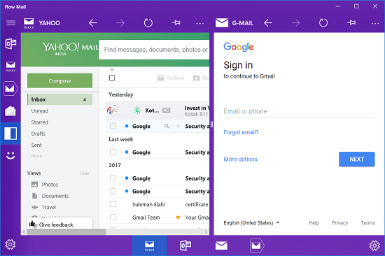 Flow Mail is a simple third-party email app for Windows 10. It lets you add your Gmail, Yahoo, Yandex, and Outlook accounts in it. It comes with an intuitive interface where you can manage your multiple email accounts. It offers a split view feature by which you can open your two different accounts side by side in the main window of the app. Also, you can sign in all your email accounts and manage them. It is basically a web wrapper of the email services that it supports. And you can opt to open the external links in the app itself rather in Microsoft Edge or any other browser.