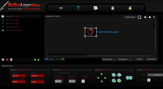 Online Logo Maker is a a totally free online logo maker using which you can make logos in good quality effortlessly. This online tool offers you with a wide range of symbols among several categories. So you can choose a symbol that suits your website or business. This online logo maker even allows you to add text or add your image to your logo to make it unique and more attractive. Online logo maker is a powerful tool to rotate, resize or transform your logos. The interface is very clean and straight-forward, as it includes a main working area, toolbar, properties bar, and objects panel. The properties bar offers you with options to adjust the object position, object size, text font and color, etc. This online logo maker even allows you to register yourself and create an account with this service in order to save the logos that you create. In addition, the logos that you create can be easily downloaded in PNG format. Try Online Logo Maker here.