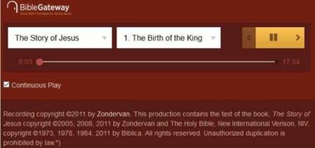 Bible Gateway is a nice website to listen to the Bible. In this website you will have three drop down boxes right at the top. The first one is to select the type of Bible where you can even select a language in which you want to hear the Bible. Second one is to select the different version of the book in a particular language. Third is to select the chapter which you want to start hearing. After selecting these three click on the play button given at the end. The audio player pop up window will open up as shown in the screenshot below.