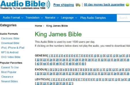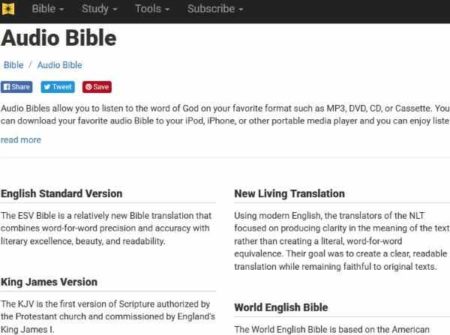 Bible.com is a nice website to listen to audio Bible. On this website you will see no graphics, most of it has text only. All the different Bible versions and translations you can hear are listed on the home page. Scroll through the list and choose the one that you would like to listen to. Click on the book title to open it up.