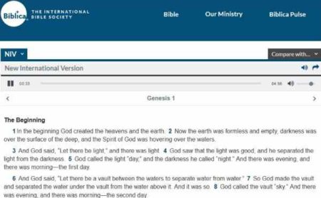 Biblica is a nice website with audio resources to listen to the Bible. The home page of the Bible can be seen in the screenshot above. Click on the listen online button to go to the next page. On this page you will have a top bar from where you can change the version and chapter of the bible. Adjacent to the audio player you will see a drop down icon on the left side. From here you can select a Bible in your choice of language.