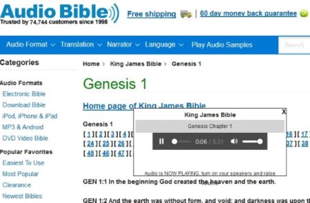 In this screen you will have a popup of the audio player and the text of the chapter will also be listed on the page. The audio player has regular controls like play, pause, forward, reverse. You can play the audio and keep working on the computer. It will keep playing the Bible in the background.