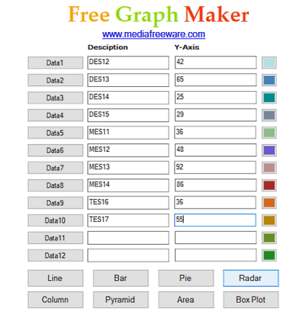 As the name suggests, Free Graph Maker is a free software to make various types of graphs. Along with the Radar Chart, you can use this software to make Line, Bar, Pie, Column, Pyramid, Area, and Box Plot chart as well. When you open this software, it gives you a data grid where you can input up to 12 data values for the chart. In that grid, you can enter the values along with descriptions (or names). You can also choose a color for each value and make the data color coded.