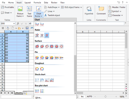The process of making the radar chart with this software is same as of the Gnumeric spreadsheet. All you have to do is enter your data names and values in the two adjacent columns. Then, select all the values in both those columns and go to the Chart frame option from the top ribbon. From the Chart frame option, choose a radar plot and drag an area on the spreadsheet for the chart. As you do that, this software inserts the resulting radar chart on the selected area on the sheet. From there, you can save the chart in the spreadsheet or export it as an image or PDF file.