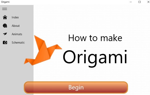 Origami is the first app in this list to learn this paper folding art. The home page of this app can be seen in the screenshot above. The app has a pretty neat interface and you can click on the begin button to start with the app. Once you click the begin button an additional menu will appear next to the main menu. This additional menu will have all the shapes mentioned on it which you can try and make. When you click on a shape, the tutorial for that will open up on the window to the right. This can be seen in the screenshot below.