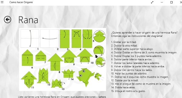 Como Hacer Origami is a origami app built in Spanish. All the text in the app is also in Spanish. The home page of the app can be seen in the screenshot above. When you right click on the app window a menu will open up at the top of the window. These are all the shapes that you can make using this app. I you are not able to understand the names in Spanish, then don’t worry. Just click on a shape and it will open up in the window below. From the shape you can make out which animal it is. Like the one I opened can be seen in the screenshot below.