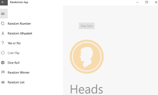 Randomizer is a free Windows 10 random decision maker. The interface of the app can be seen in the screenshot above. On the left side of the app you can see all the tools available to you for making a decision. You can choose random number option to pick a random number from a defined range of numbers. Random Alphabet will pick out a random letter from the alphabets. Yes or no will give you the answer in yes or no. Coin flip will let you flip a coin by clicking a button and show you the result. Dice roll will help you make a decision by rolling dice. Random winner option will pick out a random winner name from a list of given names. Random list will randomize a list of names in particular order.