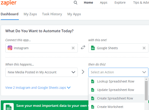 Step 1: In the very beginning, select Google Sheet and Instagram for your Zap and then specify what you want to do. So, select action from the Instagram to “New Media Posted in My Account”. Similarly, in the Google Sheets, you select the action “Create Spreadsheet Row”.