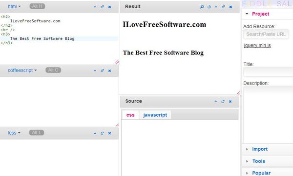 It has a very unique layout. A unique box is created for HTML, CSS and Javascript where you edit their respective codes. Results from all three boxes are then combined in the Results box where you can check out the code preview. To save your work, you’ll need to register an account with the website.