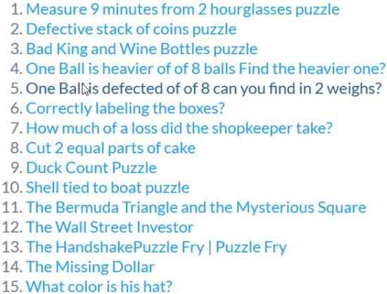 This website features top 50 most common interview puzzles with answers. The puzzles are divided into two parts with each part containing 25 questions each. Most of these questions are said to have been asked in job interviews for companies like Microsoft, Amazon, Paytm, etc. As you scroll down the page, you will see all the questions listed one after the other. For knowing the answer to a question, just click on the question and it will open up in another tab with the answer displayed below the question. If you have a alternative or better way to solve the puzzle then you can also submit your answer to this website. Apart from interview puzzles the website also contains other types of fun puzzles.