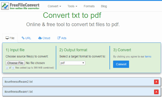 FreeFileConvert is better than “Soda PDF Online” because it lets you convert 5 text files to PDF at once. Also, there is no per hour limit for text file conversion. The size limit for input files is 300 MB, which is another good feature. A separate PDF is generated for each text file and you can download all those PDF files one by one.