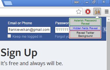 It’s a bit more simpler from the previously mentioned password revealer extension. There’s no hidden field revealer here, but passwords are easily revealed by left clicking on the address bar icon, which is put in the address bar automatically every time a password is typed into registration/login forms.