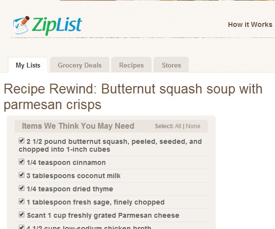 With ZipList you can easily clip recipes from websites, and then save them to your ZipList account. From there, you can export the ingredients of the recipe into a grocery list.