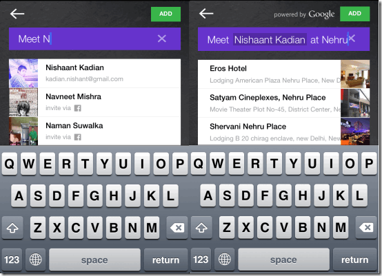 To add events, tap on the plus icon at top right. You will see a text box, current date, and time interval for the event. Enter the name of event in the text box. The app will start displaying the suggestions of persons to add, venue to meet. You can choose to use them or write them manually. Now, choose the date and time interval for event as per your choice. Tap on Add option at top right to add the event to calendar. Just when you tap the Add button, the event will be added to Cal app, Google Calendar, and iCloud simultaneously. The app also sends invitation to the person added to the event.