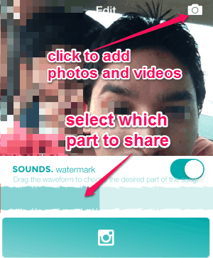 One of the interesting features of this app is that it lets you add photos and videos from your camera roll to any music before sharing. Simply tap the camera icon at the top to add photos and videos. You can also select which part of the song you want to share on Instagram. The following screenshot shows how to add photos and choose parts of music.