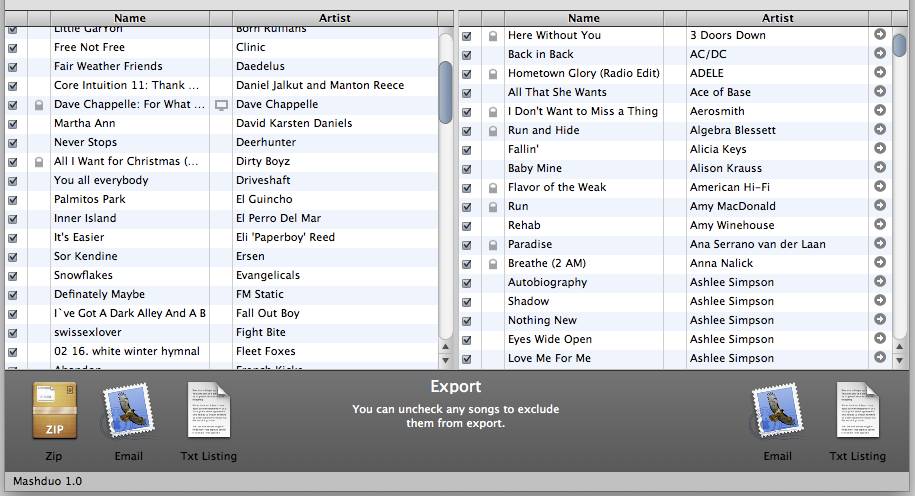 Mashduo is a free iTunes library comparison tool for Mac which you can use in order to easily and in a few clicks compare two different libraries to see how many of the songs are the same. To use Mashduo you don’t have to copy entire collections to a single computer, you just have to load the XML files which are not a problem to transfer over email for example, since they are very small in size.