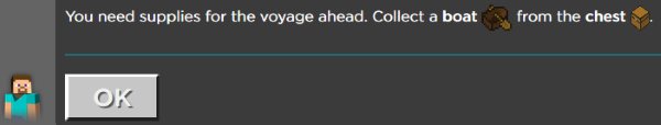 On the extreme left side is the Minecraft game space, this is where your programs run. On the top right side you will see a instructions box. This instructions box tells you what has to be done next. Below the instructions box is the code block on the left. Your workspace where you make programs is on the right. You will get instructions pop ups on what to do next, like the one shown in the screenshot below.