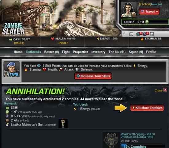Zombie Slayer is a free zombie game for Facebook. When you start playing this game, the first screen you will see is the one to choose a character from among the many given. After choosing a character, you will be shown a screen where you will be told to kill zombies in a particular area. Click on the red button labeled kill more Zombies. Then you will get a screen like the one shown in the screenshot above. The screen gives you a message that you have killed two zombies and there are 44 more to kill in that area. You will also be asked to power up or increase you skills for further fights. There is no animation or graphics where you fight off with the zombies. You only get the kill more zombies button and keep a check on your health and energy before going into a fight.