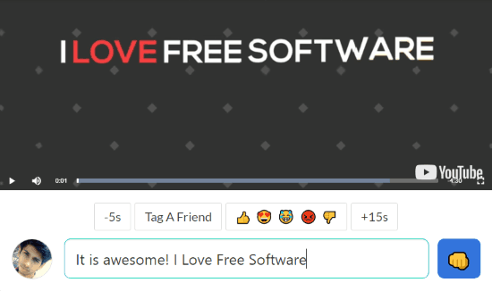 This tutorial is about how to add comments to specific parts of a YouTube video. You can now easily add comments to any specific playback time of a YouTube video. This can be done using a free website called “Aech“. It lets you play any YouTube video and then you can choose any video part to add comments (or reactions with emoticons) to it. Then you can share the video with your group or make it publicly available for others. Another interesting feature of this website is that apart from letting you add comments to the video, it also allows all the other members of your group (or global users for public videos) to add comments.