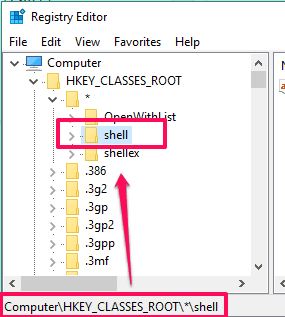 Step 1: Open Windows 10 Registry Editor and access the “shell” key: HKEY_CLASSES_ROOT → * → shell.