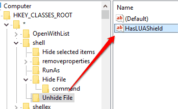Step 4: Under Unhide File key, create a String value and set its name as “HasLUAShield“.