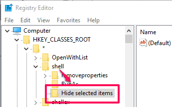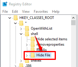 Step 1: Go to HKEY_CLASSES_ROOT → * → shell. Now create a key under this shell key and name it “Hide File“.