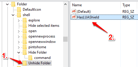 Step 9: Create another key under shell key and name it as Unhide Folder. After that, under Unhide Folder key, create a String value and set its name as “HasLUAShield“.