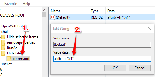 Step 2: Under Hide File key, create command key and set “attrib +h “%1”” as value data in default String value.
