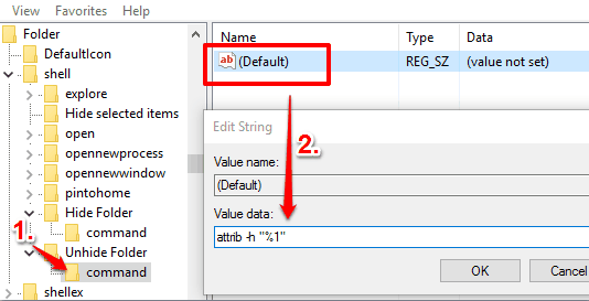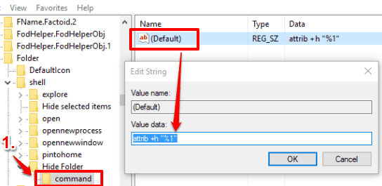 Step 8: Create command key under Hide Folder key and set “attrib +h “%1”” value data in default String value.
