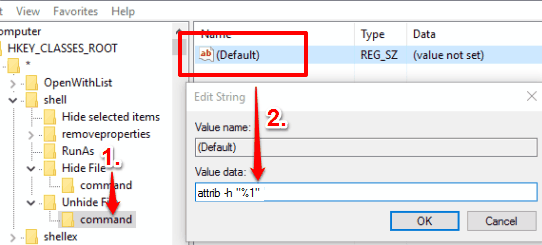 Step 5: Now create “command” key under Unhide File key and set “attrib -h “%1”” as value data in default String value.