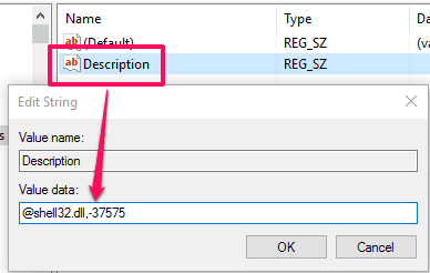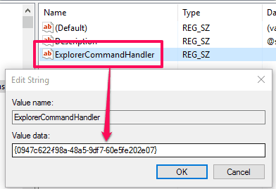 @shell32.dll,-37575. - ExplorerCommandHandler value: Under its Value data field, add “