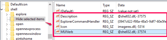 Step 2: Under this shell key, create a new key and name it “Hide selected items“.