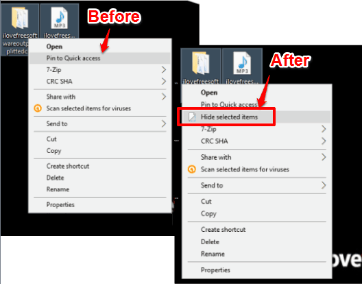 In the screenshot below, you can see that before, there is no hide selected items option available, but after it is clearly visible using which you can easily hide the items.